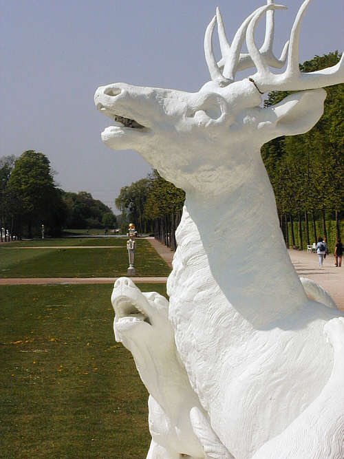 Aktäon, der von Diana zur Strafe in einen Hirsch verwandelt und von ihren Hunden zerrissen wird, ist eine Allegorie auf die Untergang der Sonne am Abend. Die Hirschgruppe steht daher im Westen des Gartenzirkels, während im Osten die beiden goldenen Figuren der Morgenröte stehen.