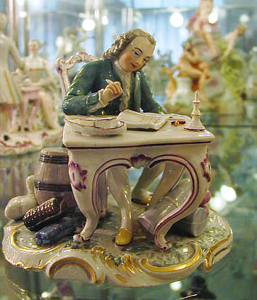 Kaufmann in seinem Kontor, auf dem Tisch das Geschäftsbuch, eine Schale und ein Kerzenständer, neben ihm Waren als Zeichen seiner Geschäftigkeit