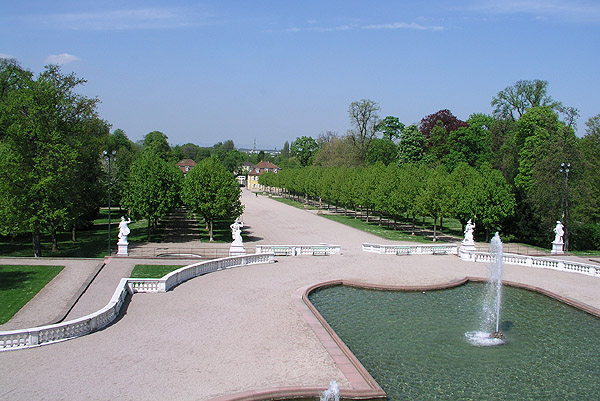Vom usprünglichen Garten besteht nur noch die breite Mittelachse, die sich als Landschaftsachse durch den ganzen westlich anschließenden Lußhardtwald zog und die Grundachse eines Systems von parallelen und rechtwinklig kreuzenden Wegen bildete. Die barocken Parterres wurden im 19. Jahrhundert aufgegeben und durch Abteile im Stil eines englischen Landschaftsparks ersetzt. Am