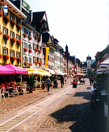 Kaiserstraße nach Osten Die Kaiserstraße durchzieht die Altstadt als Marktstraße vo einem Stadttor bis zum anderen. Die Altstadt selbst besteht nur aus ihr und zwei Parallelstraßen. Im Hintergrund links mit rosa Fassade das Rathaus von 1766.