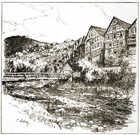 Dieselbe Stelle wie das Blatt "Häuser an der Kinzig", nur von weiter flussabwärts aus gesehen.