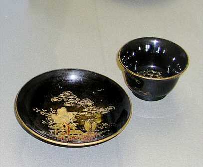 Schwartz Porcelain Set Teekoppchen mit Unterschalen Süddeutschland (?), 1. Viertel 18. Jh. Holz, Schwarzlack, Dekor in Gold Staatliche Schlösser und Gärten Baden-Württemberg (Rastatt, Schloss Favorite)