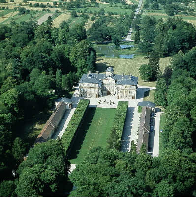 Vor dem Schloss die beiden Orangerieflügel, dazwischen kubisch geschnittene Baumreihen. Hinterdem Schloss der Park mit dem Fischweihe und der nach Kuppenheim ziehenden Schlossachse.
