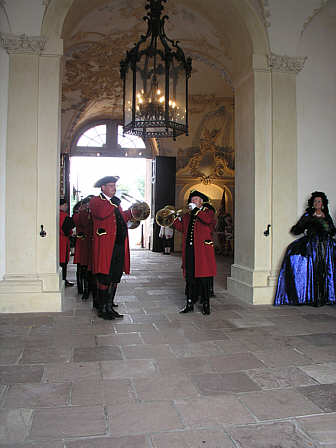 Die Jagdhornbläser „Rallye Trompes de la Forêt Noire” spielen dem hochwohlgeborenen Fürstenpaar auf.