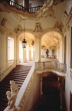 Symmetrisch angeordnete Treppenanlagen führen vom Parterre zum Oberen Vestibül, von dem aus der Ahnensaal zugänglich ist. Über den Treppen öffnen sich laternenartig Galerien in das darüberliegende Stockwerk.