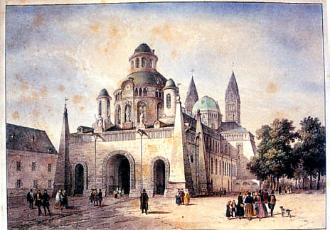 Ab 1775 verwirklichte "Sparlösung" Franz Ignaz Neumanns zum Wiederaufbau des Westwerks. Das romanische Untergeschoss des Westbaus ist gesichert, aber nicht bis zur ursprünglich vorgesehenen Höhe aufgeführt. |