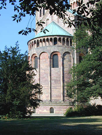 Die Mittelschiffwand zeigt ebenfalls rundbogig geschlossene Fenster,	darüber