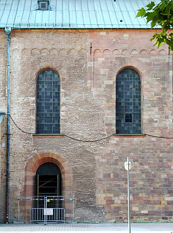 Zwischen dem 5. und dem 6. Fenster des Mittelschiffs ist mit der Grenze zwischen
