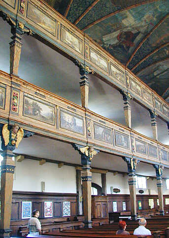 Umlaufende Emporen mit Darstellungen aus der biblischen Geschichte, darüber ein flaches hölzernes Kreuzgratgewölbe mit reicher Bemalung