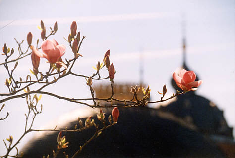 Der Garten hinter der Moschee entfaltet seinen vollen Zauber im Frühling zur Magnolienbüte, jat aber durch das Spiel von Licht und Schatten sowie die wechselnden Blicke zu den Minarett-Türmen zu jeder Jahreszeit seinen besonderen Reiz.