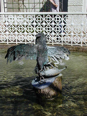 Darunter die wasserspeienden Vögel auf der Stange. Im Originlzustand