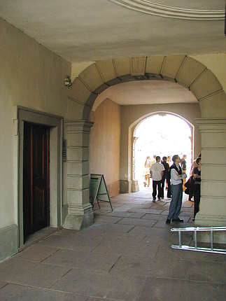 Baunaht zwischen dem Altbau (hinten) und dem 1715 - 1717 errichteten Gartenflügel in der Tordurchfahrt.