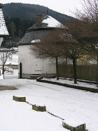 Rundtürme in verputzter Fachwerkbauweise vermutlich aus der Neubauzeit des 18. Jahrhunderts.