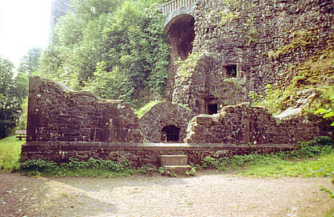 Die alte Zugbrücke ist heute durch eine Betonbrücke ersetzt (am oberen Bildrand). Rechts darunter die Fenster der vom Burghof herabführenden Wendeltreppe, die früher den einzigen Zugang zum Brunnenhaus bot.