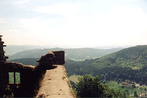 Blick von der Plattform des Treppenturms nach Osten. Rechts am Waldrand die Pass-Straße mit der "Herberge zum Löwen.