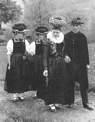 |  | Hochzeitszug in Gutach Die Braut trägt die Hochzeitstracht, die aus dem prächtigen Schäpel und dem breiten Faltenkragen besteht, beide Brautleute tragen einen Rosmarinzweig, sie in der Hand, er am Hut. Dahinter zwei junge Frauen im Bollenhut (Brautjungfern). |