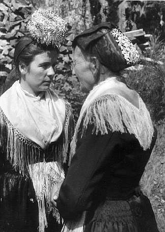 Die Haube mit der flachen Schleife zeigt einen prächtig bestickten Silberboden, wie er im Kinzigtal oft vorkommt (siehe Wolfach). Der Schäpel ist kleiner als z.B. im benachbarten Wolfach