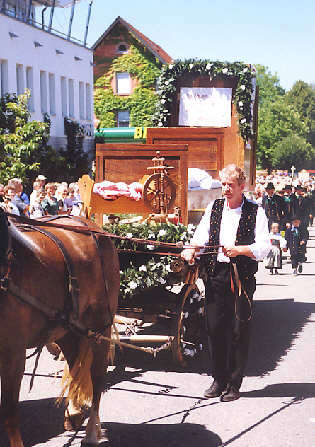 Rechts: Aussteuerwagen der Trachten- und Volkstanzgruppe Hausach-Einbach