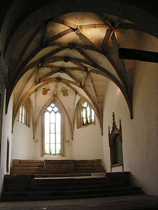 1469 durch Verlängerung des Mittelschiffs über den Kreuzgang hinweg gewonnener Chorraum, wegen der Höhenverhältnisse über dem Kreuzgang insgesamt mit 10 Stufen. Drei-Achtel-Schluss mit Netzgewölbe.