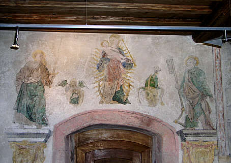 Madonna im Strahlenkranz auf der Mondsichel mit den Heiligen Petrus (mit dem Schlüssel, rechts) und Paulus mit dem Schwert, links)