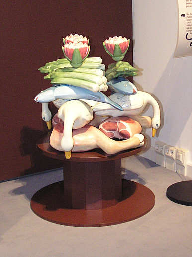 Der fertig aufgetürmte Opfertisch mit den Lebensmitteln