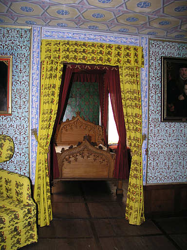 zugänglich) hat ein Bett mit neugotischen Schnitzereien.