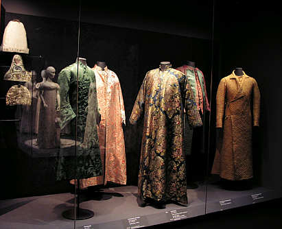 Hausmäntel (Männerkleidung) In der Mitte ein seidenes Stück aus dem Besitz des Markgrafen von Baden (1735/45), links davon ein Mantel aus Seidentaft, 1760/70, ganz links ein grüner halblanger Mantel, um 1730.