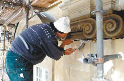 Steinmetz bei der Arbeit an der Westfassade
