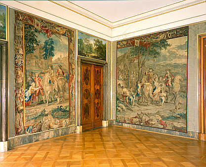 Tafelzimmer in der Beletage des Alten Corps de logis; mit Tapisserien aus der Kriegskunstserie, entstanden in Brüssel um 1720