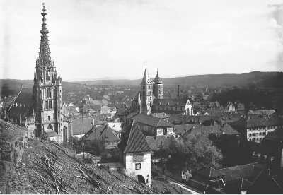 Blick von Westen über die Altstadt mit Stadtkirche St. Dionys. Links am Hang die Frauenkirche.