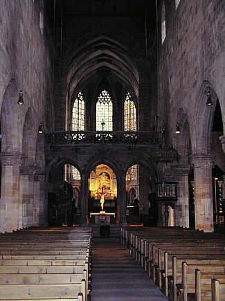 3schiffige gotische Basilika mit hochgelegenen Obergadenfenstern. 3-teiliger Lettner von Lorenz Lechler aus Heidelberg (1486-89) Dahinter der Chor aus dem letzten Viertel des 13. Jahrhunderts mit Fenstern der Bauzeit.
