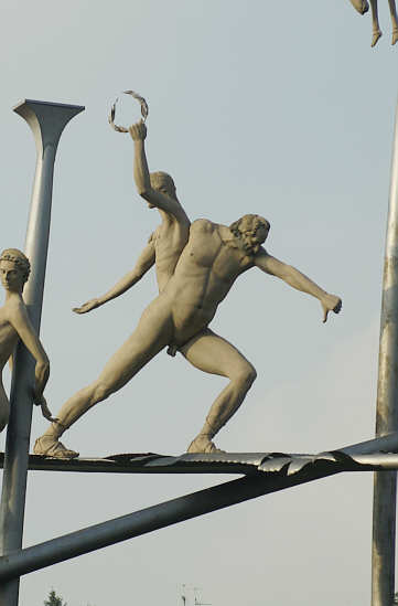 dieser in Siegerpose mit emporgehaltenem Lorbeerkranz, jener