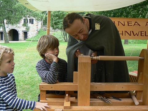 Ein Drechsler zeigt an seiner nachgebauten Maschine, wie man