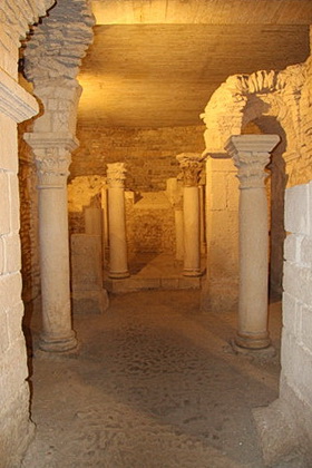 Die Kryptenanlage besteht aus einer innen liegenden Confessio, um die herum ein rechtwinklig abknickender Umgang führte. Im Scheitel dieser Konfession (und in Höhe der Mitte des Umgangs) öffnet sich ein dreischiffiger Gang mit drei Jochen (2x2 Pfeiler und 1x2 Säulen) zu einer sechseckigen Scheitelkapelle, deren sechs Säulen ebenfalls durch ein im Boden eingelegtes Sechseck verbunden sind.