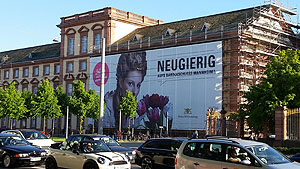 Als die Sanierung des östlichen Schlossflügels anstand, erkannten die Staatlichen Schlösser und Gärten die Chance, die notwendige Verhängung der Fassaden für einen temporären „Hingucker“ zu nutzen. So entstand die Idee, großflächig für den Schlossbesuch zu werben. Das Motiv an der Bismarckstraße: eine Dame in barockem Kostüm und mit aufwendiger Frisur, passend zur Entstehungszeit des Mannheimer Schlosses. Das Motiv deutet eine Geschichte an und soll neugierig machen auf den Besuch im Barockschloss. Am Eckpavillon zum Ehrenhof ist es ein barockes Paar, das den Weg zum Schlossmuseum weist.