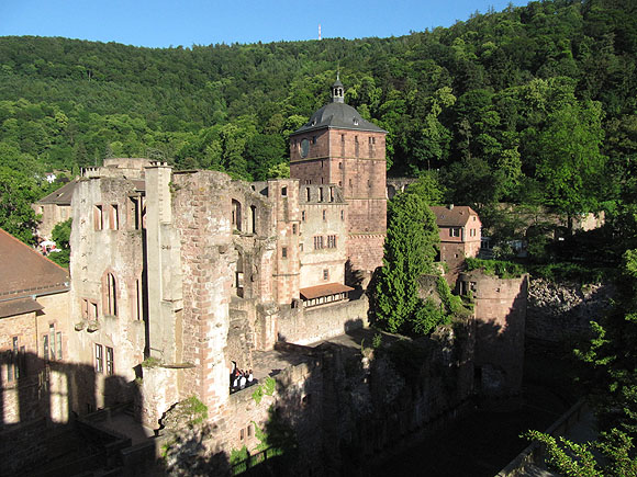 Schloss Heidelberg: Die Westseite des Schlosses mit Zeugen der Bautätigkeit Ludwigs V.: Links angeschnitten der Königssaal im Frauenzimmerbau, dann die Ruine des Herrentafelstubenbaus, der Ruprechtsbau, dahinter der Tortum mit dem Brückenhaus. Rechts vorn das zur Befestigung des Hirschgrabens gehörende Eckrondell "Seltenleer".