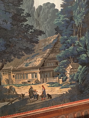 Zwei Ansichten der Tapete und Detailansichten: Bauernhaus, "Landleute", eine Bärenjagd, der Rhonegletscher und die Teufelsbrücke in der Schöllenenschlucht.