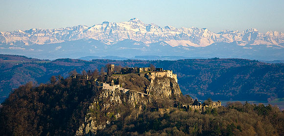 Festungsruine Hohentwiel vor der Kulisse der Schweizer Alpen. Foto: Achim Mende /SSG/LMZ