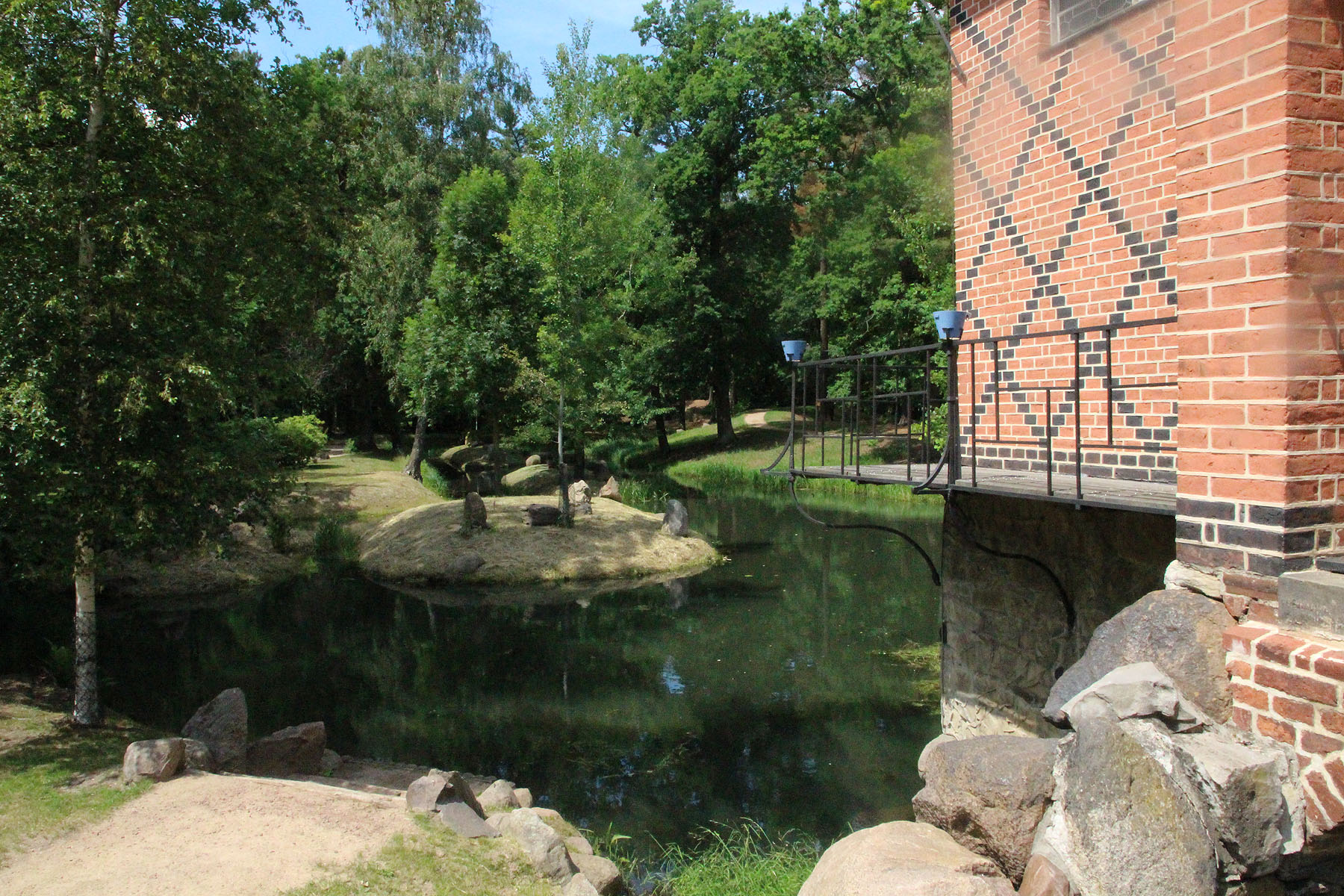 Der Schlosspark hat die Zeiten im Wesentlichen überstanden. Das Rasenparterre ist sichtbar, die Boskette umschließen die offene Fläche. Die Perlen aber sind im Wäldchen versteckt: Da steht eine chinesische Pagode, da steht auch, malerisch am Wasser gelegen, ein chinesisches Teehaus.