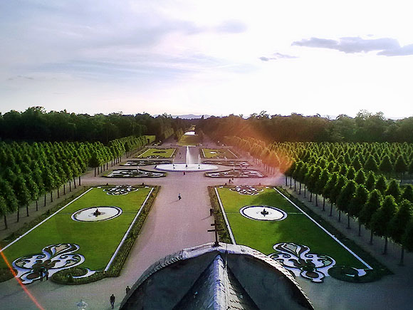 Blick auf der Garten-Achse von der Rückseite des Teichs bis zum Schloss und weiter auf den Königstuhl.