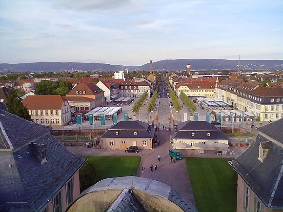 Schloss Schwetzingen, Blick vom Dach des Schlosses nach Osten zum Königstuhl und nach Westen zur Kalmit.