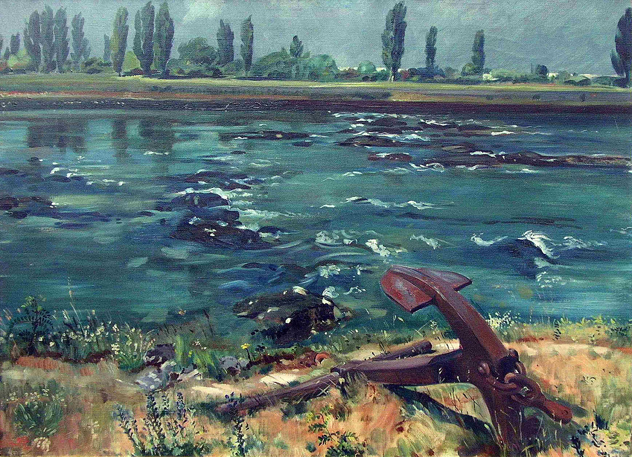 „Anker am Rhein“, Ölgemälde von 1934 von Hermann Burte, Maler und populärster badischer Dichter während des NS-Regimes (Sammlung Dreiländermuseum)