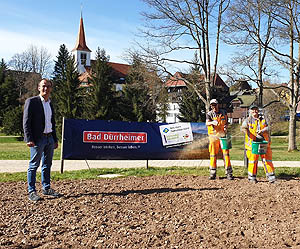 Wie bereits bei der Veranstaltung im Oktober angekündigt, wurden nun als erste Aktion zwei prominent im Kurgarten gelegene Flächen mit gebietsheimischen Wildblumensamen eingesät. Sie haben eine Gesamtgröße von rund 1.500 Quadratmetern. Werkhofmitarbeiter Andreas Fischer und Gemeindegärtnerin Michaela Kienzler führten die Einsaat per Hand durch. Vorher hatten sie die Flächen im Abstand von mehreren Wochen mehrmals gefräst und geeggt, damit sie möglichst frei von unerwünschten Beikräutern sind. Nun freuen sie sich zusammen mit dem Bürgermeister, dass hier alles bald blüht und die Blühflächen einen neuen Aspekt in den Kurgarten bringen.