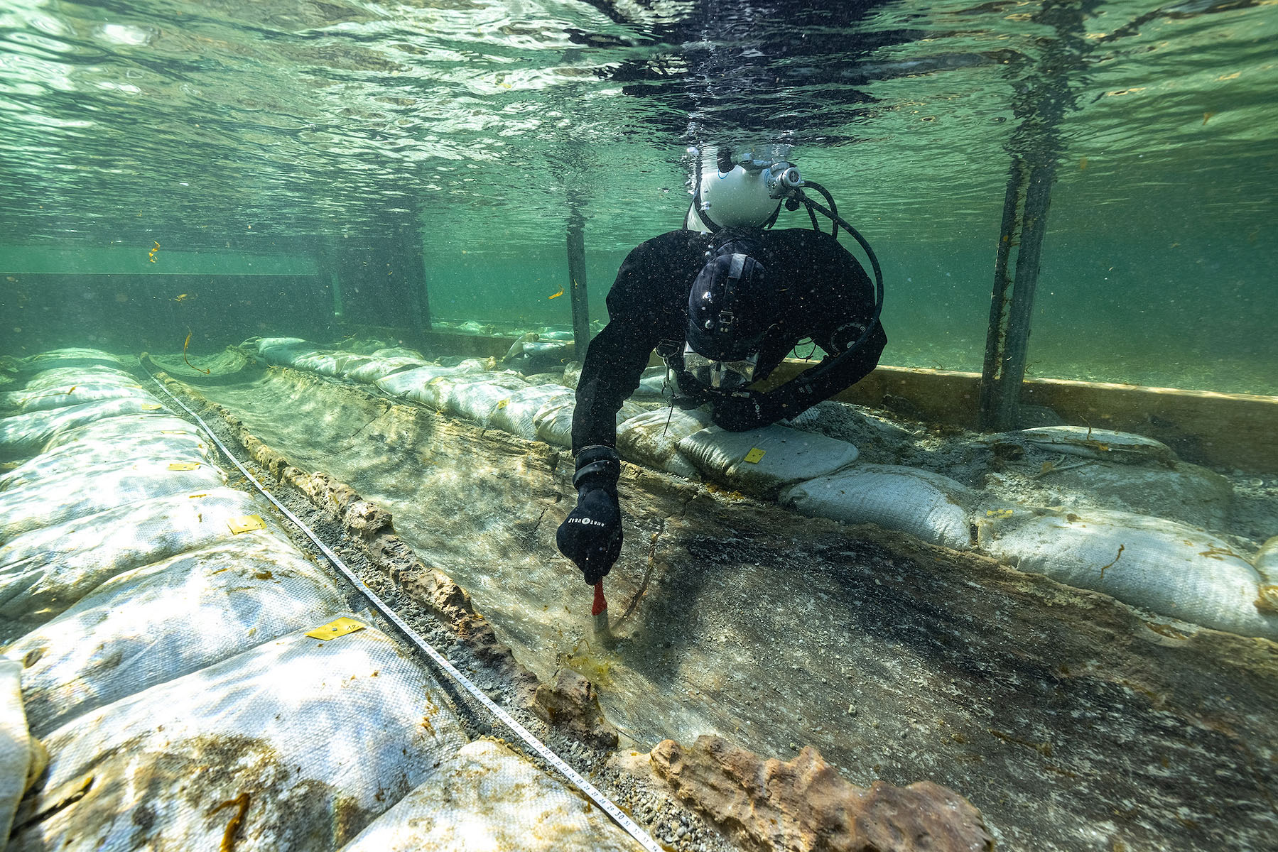 Blick auf den eingehausten Einbaum mit Forschungstauchern aus der Luft