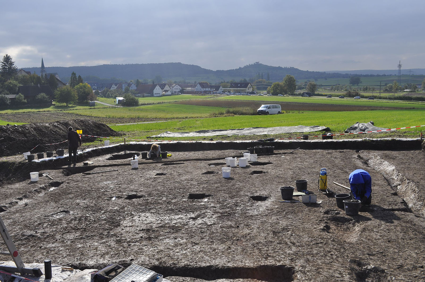 Zunächst konnte im Frühjahr 2021 das Siedlungsareal auf einer Fläche von rund sechs Hektar mittels geophysikalischer Messungen durch die Fachfirma Terrana aus Mössingen aufgenommen und erste Hinweise jungsteinzeitlicher Besiedlungsstrukturen kartiert werden. Die Magnetfeldmessungen zeigten, dass die Reste mehrerer der charakteristischen Langhäuser (die Dimensionen von über 30 Metern Länge erreichen können) noch im Boden erhalten sind und einen Siedlungsplatz der sogenannten Linienbandkeramischen Kultur, der frühesten bäuerlichen Bevölkerungsgruppe in Südwestdeutschland im 6. Jahrtausend v. Chr., belegen. Auf dieser Basis gelang es während einer vierwöchigen Grabungskampagne im Frühherbst 2021 unter der örtlichen Leitung von Veronika Stein (Universität Tübingen), Ausschnitte von einem der jungsteinzeitlichen Hausgrundrisse archäologisch zu untersuchen und zu dokumentieren. „Verfärbungen im Boden lassen die Standspuren der ehemaligen Pfosten der Hauskonstruktion erkennen, ebenso wie Gräbchenstrukturen, die als letzte Hinweise auf Wände des Hauses zu deuten sind,“ erläutert Dr. Jörg Bofinger.