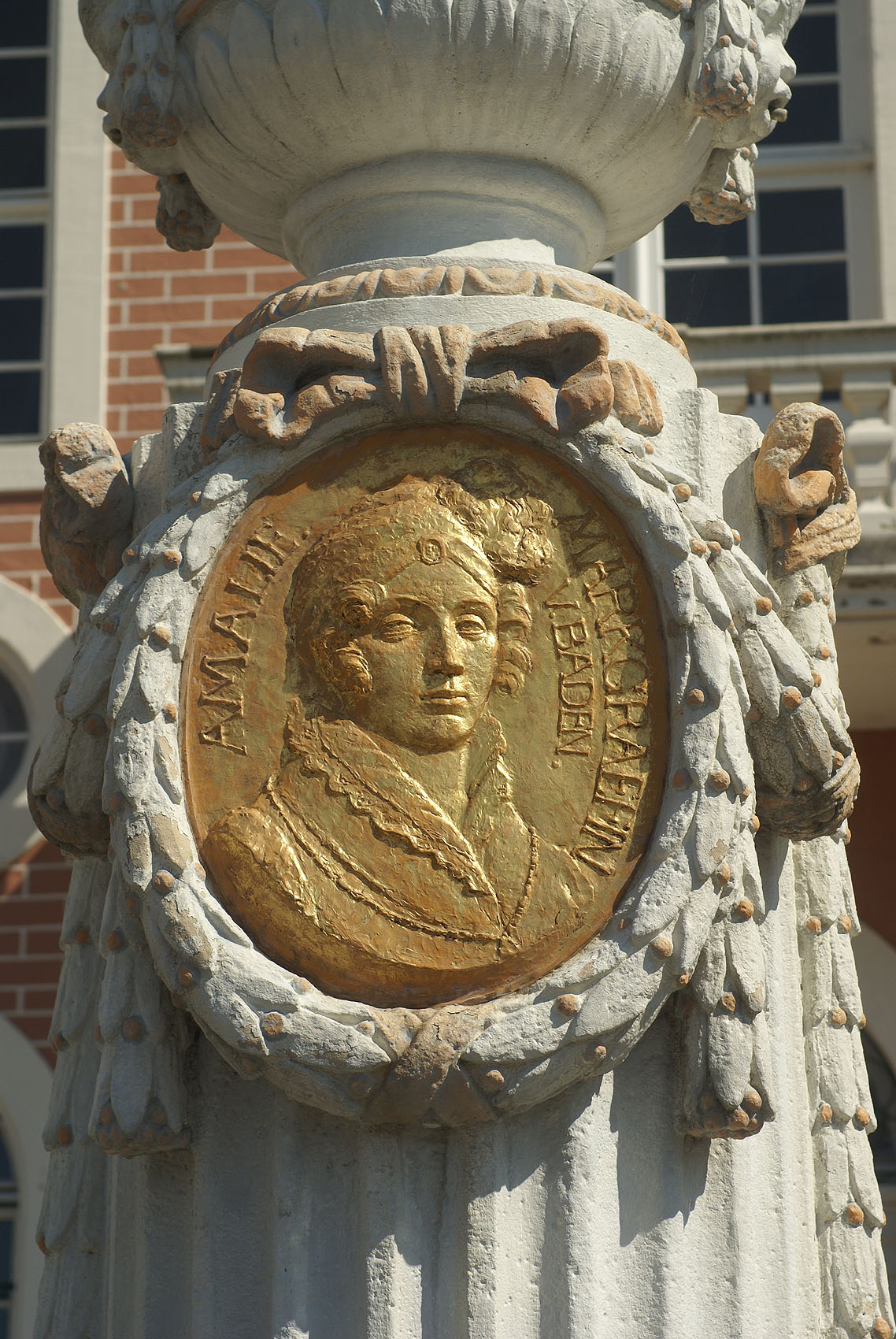 Amalienbrunnen vor dem Amtsgericht, Porträtmedaillon der Markgräfin Amalie.