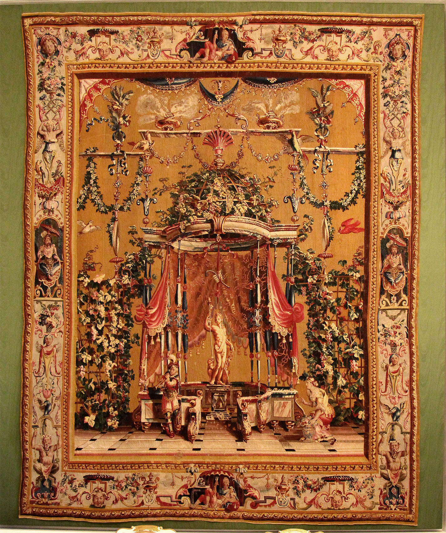Mit Löwenfüßen, verdrehten Ohren und einem Rüssel, der dem Brausekopf einer Gießkanne ähnelt: Einer der Wandteppiche in Schloss Bruchsal zeigt einen ganz besonderen Elefanten. Auf dem Rücken des festlich geschmückten Dickhäuters sitzt sein Treiber. Die Tapisserie „Elefantentreiber“ gehört zur sogenannten „Groteskenfolge“ im Jagdzimmer von Schloss Bruchsal. Sie entstand zwischen 1685 und 1719 im nordfranzösischen Beauvais. Den Gästen des Fürstbischofs fielen die seltsamen Details der Elefanten-Gestalt wohl nicht weiter auf. Im 18. Jahrhundert gab es in Europa nur wenige Menschen, die einen Elefanten zu Gesicht bekamen. Es waren vor allem Adelige, die in ferne Länder oder an die Höfe bedeutender Regenten reisen konnten, wo Elefanten und andere exotische Tiere zum Hof gehörten.