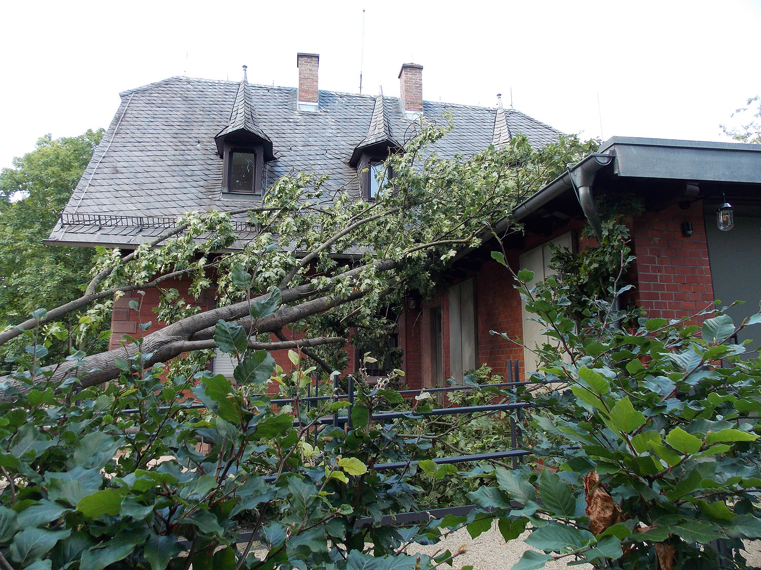 (ssg) Ein Schreck am Montagmorgen: Das Unwetter in der Nacht vom Sonntag hat mächtige Äste von einem der Bäume in der unmittelbaren Nähe der Grabkapelle brechen lassen. Der Schaden betrifft das Wächterhaus mit dem Besucherzentrum – die Grabkapelle ist unversehrt. Derzeit wird das Ausmaß der Sturmschäden noch untersucht.
