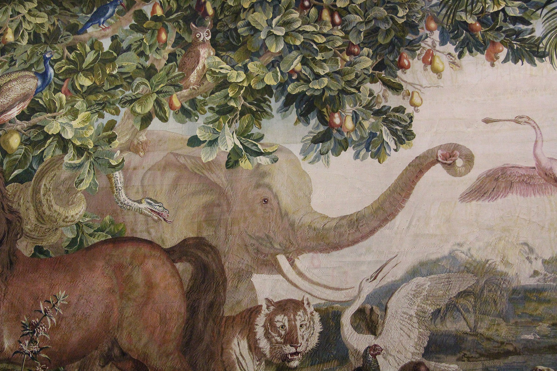 Der graue Riese inmitten der paradiesischen Landschaft wirkt fast schüchtern, obwohl er doch alle überragt. Damit steht er im Gegensatz zum galoppierenden Pferd und dem stolzierenden Tiger: Die Wildtiere treten monumental in Erscheinung. Fast unscheinbar präsentieren sich die Einheimischen, die ihnen gegenüberstehen. Tiere und Menschen leben in Einklang miteinander. Die wandfüllenden Teppiche der „Neu-Indien-Serie“ von Schloss Mannheim zeigen eine Wunschvorstellung.