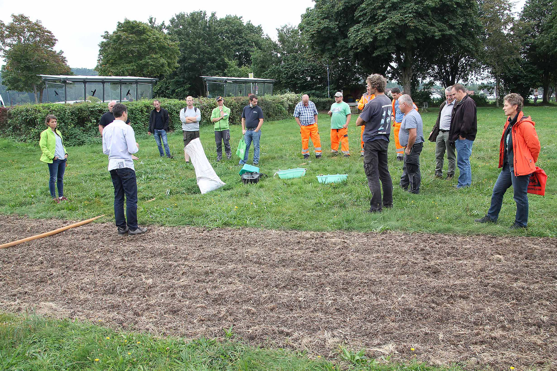 Der Landschaftsökologe Holger Loritz (2. v. li.) erläutert das Prinzip der Wiesenaufwertung anhand des vorbereiteten Aufwertungsstreifens an der Realschule am Salinensee in Bad Dürrheim.